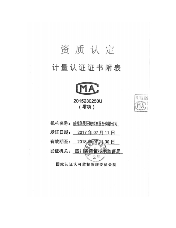 2017年7月11日,成都華展檢測(cè)服務(wù)有限公司收到了四川質(zhì)量技術(shù)監(jiān)督局頒發(fā)的檢測(cè)項(xiàng)目增項(xiàng)證書(shū),標(biāo)志著成都華展的檢測(cè)能力又提升了,為拓展公司業(yè)務(wù)提供了保證。